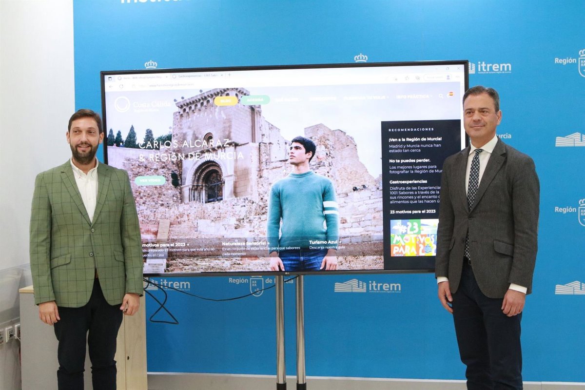 El consejero de Presidencia, Turismo, Cultura, Juventud, Deportes y Portavocía, Marcos Ortuño, y el director general del Itrem, Juan Francisco Martínez, tras la presentación de la nueva web turística - CARM