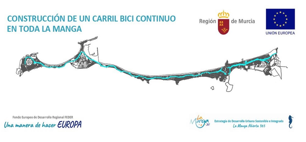 La Comunidad Autónoma ha adjudicado por 836.299 euros las obras de construcción del nuevo carril bici en La Manga del Mar Menor que se enmarcan en la estrategia regional 'La Manga 365', cofinanciada al 80 por ciento con Fondos Europeos de Desarrollo Regional (Feder) y el resto por la Comunidad, dentro de la línea 'La Manga se mueve'.