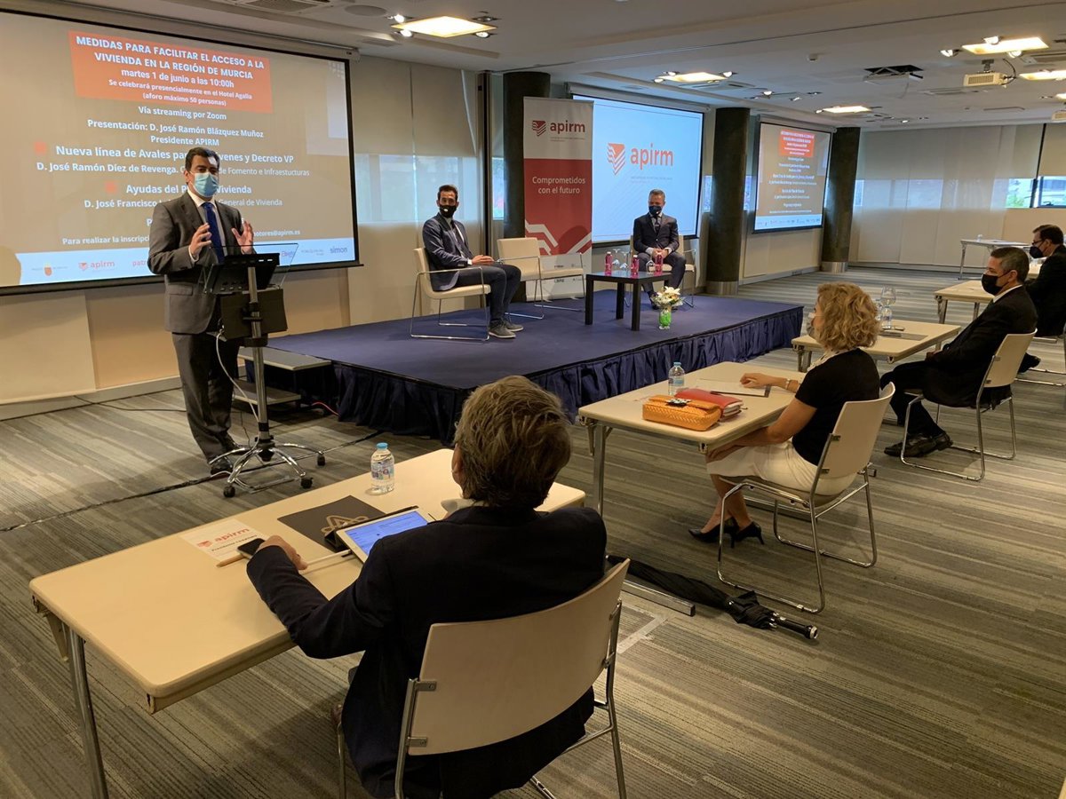 El consejero de Fomento e Infraestructuras, José Ramón Díez de Revenga, ha participado este martes en una jornada informativa organizada por la Asociación de Promotores Inmobiliarios de la Región de Murcia (Apirm) para exponer las novedades de las políticas de vivienda que impulsa el Ejecutivo regional "para garantizar que todas las personas accedan a un hogar".