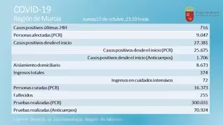 El número total de afectados en la Región de Murcia desde el comienzo de la crisis del coronavirus se sitúa en 27.381 casos, de los que 25.675 han sido acreditados mediante PCR (716 más que el día anterior, la cifra más alta registrada), según los datos del Servicio de Epidemiología correspondientes a este jueves a las 23.59 horas.