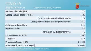 El número afectados actualmente por Covid-19 ha disminuido en la Región de Murcia en 12 personas en las últimas 24 horas, aunque se han detectado diez nuevos casos por PCR y 35 en test de anticuerpos, según el balance correspondiente a las 23.59 horas de este miércoles publicado por la Consejería de Salud.