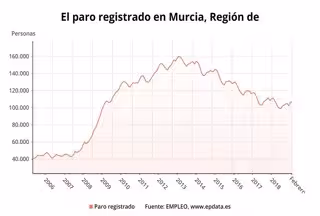 En términos relativos, el aumento del paro en el mes de febrero en la Región fue del 0,61 por ciento respecto al mes de enero. El desempleo disminuyó en términos interanuales, de forma que en los últimos 12 meses bajó en Murcia en 4.607 personas, un 4,13 por ciento menos, frente a la caída del 5,22 por ciento nacional.