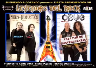 El Teatro Pujante de Beniel será el escenario de una nueva edición de 'Leyendas del Rock', que en esta ocasión cuenta con la actuación conjunta de Sherpa y Julio Castejón; así como la de Obús, dentro de su gira 'Vaya par de sinvergüenzas'.
