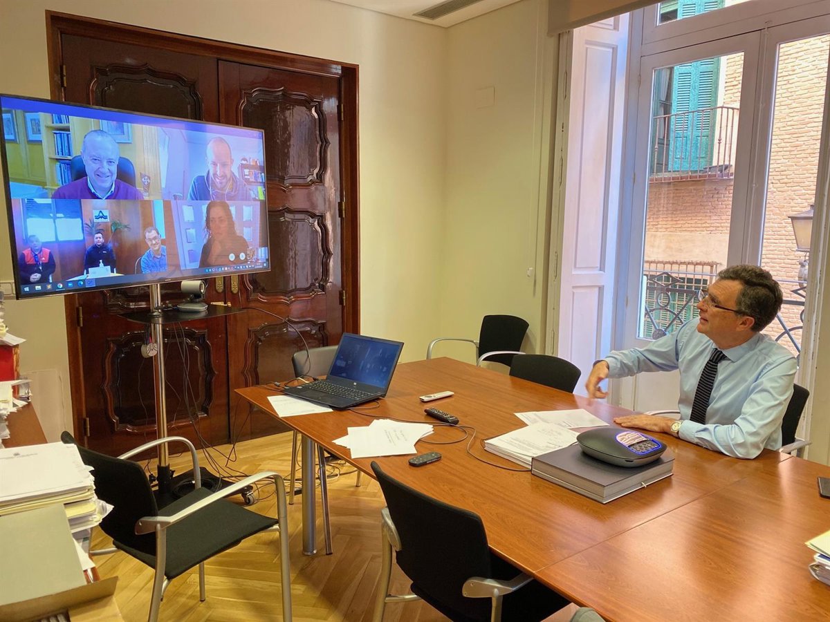 El alcalde de Murcia, José Ballesta, ha contactado este jueves, a través de videoconferencia con un grupo de operarios de Aguas de Murcia que, de forma voluntaria, se han confinado en la planta potabilizadora de La Contraparada - AYUNTAMIENTO DE MURCIA