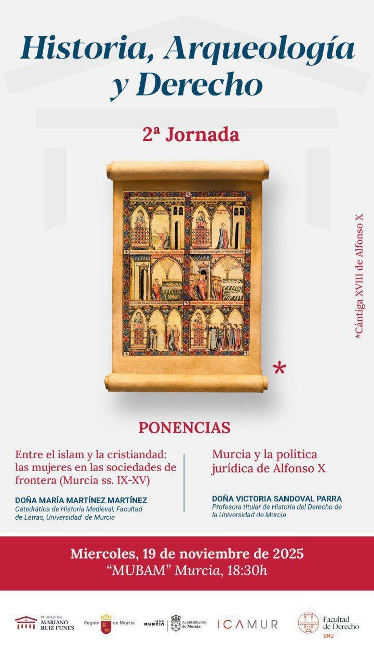 Una de las ponencias estarán a cargo de María Martínez, catedrática de Historia Medieval de la Facultad de Letras de la Universidad de Murcia, que hablará del islam y la cristiandad bajo el título 'Entre el islam y la cristiandad: las mujeres en las sociedades frontera (Murcia ss. IX-XV).