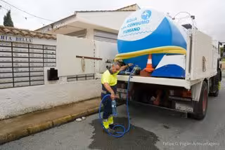 Un operario rellena una botella de agua potable de una cuba movil en Bahía Bella (Cartagena) - AYUNTAMIENTO DE CARTAGENA