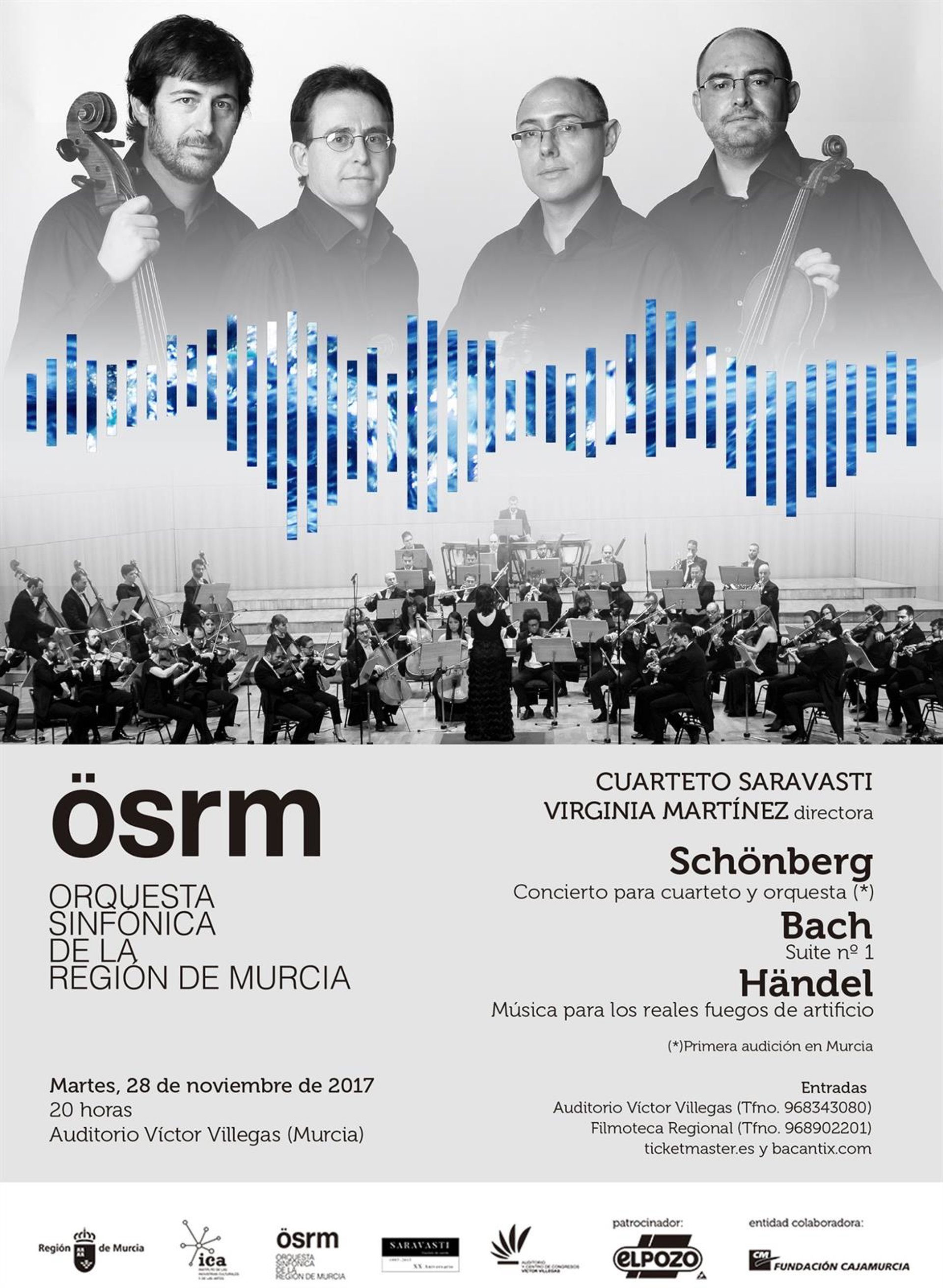 La Orquesta Sinfónica de la Región de Murcia (OSRM), con el apoyo de la Consejería de Turismo, Cultura y Medio Ambiente, ofrece el martes, 28 de noviembre, el tercero de los conciertos de su ciclo de abono en el Auditorio Víctor Villegas junto al Cuarteto Saravasti, que este año celebra su vigésimo aniversario sobre los escenarios con su propio ciclo de conciertos.