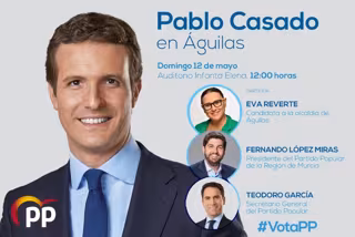 Casado estará acompañado del secretario general del PP, Teodoro García Egea, presidente del PP de la Región de Murcia, Fernando López Miras, y la candidata del PP a la Alcaldía de Águilas, Eva Reverte.