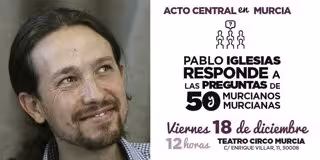 El candidato de Podemos a la presidencia del Gobierno, Pablo Iglesias, visitará este viernes, 18 de diciembre, Murcia. Será a las 12.00 horas en el Teatro Circo, donde está previsto que conteste a las preguntas de 50 murcianos.