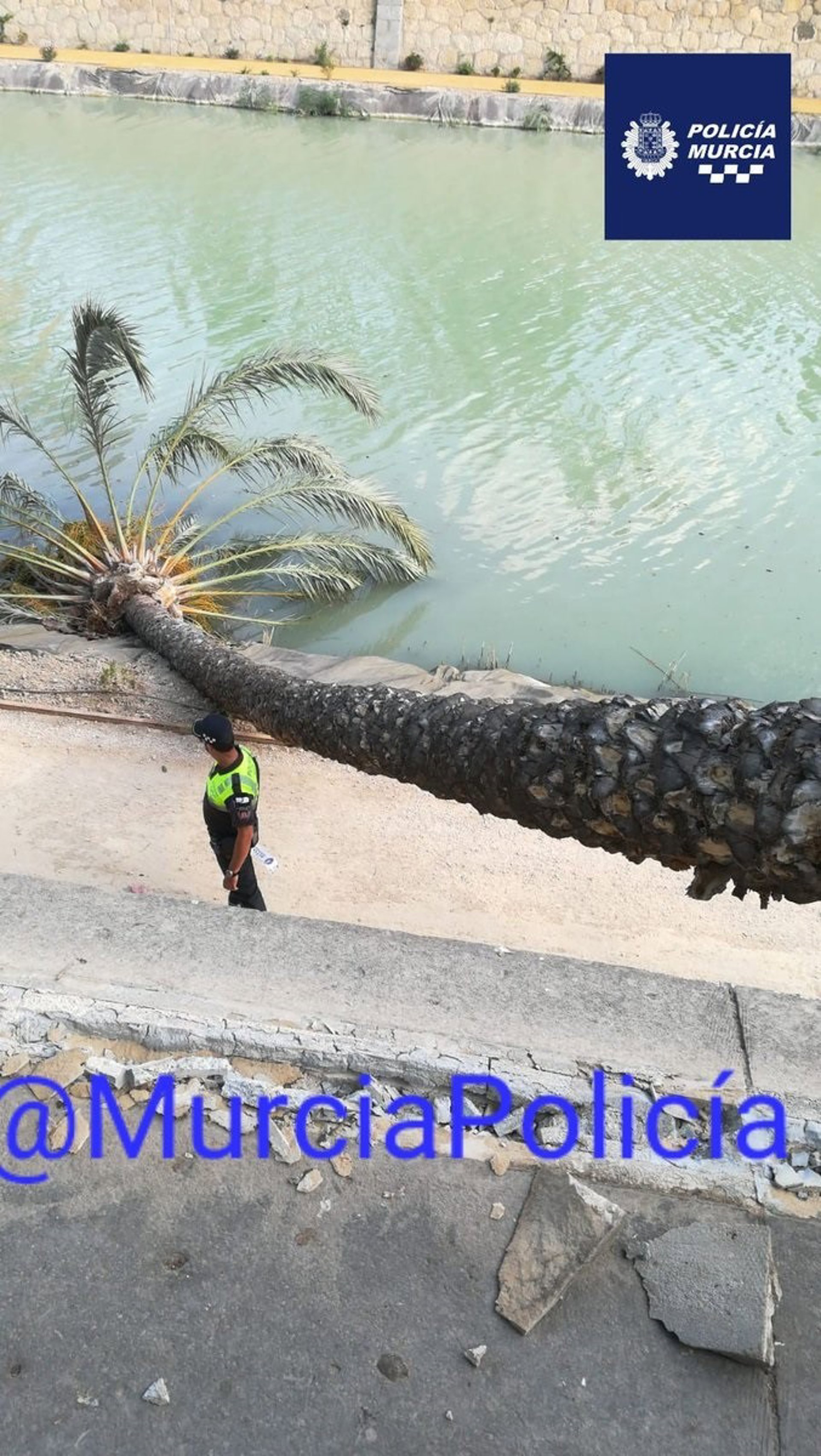 El llamante informaba que no había heridos y que la palmera de unos 8 metros de altura, había roto la valla de hierro y el hormigón tras la caída, hasta llegar al río. La Policía Local de Murcia gestionó el aviso.