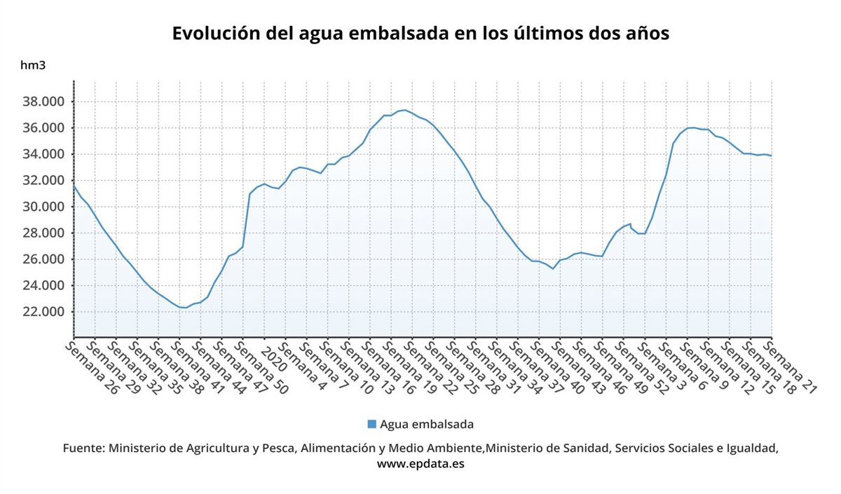 En el ámbito nacional, la reserva hidráulica ha perdido esta semana 200 hectómetros cúbicos, lo que representa un 0,4 por ciento del total, de modo que los embalses se encuentran al 60,6 por ciento de su capacidad total, según informa el Ministerio para la Transición Ecológica y el Reto Demográfico que señala que en esta semana guardan 33.875 hectómetros cúbicos.