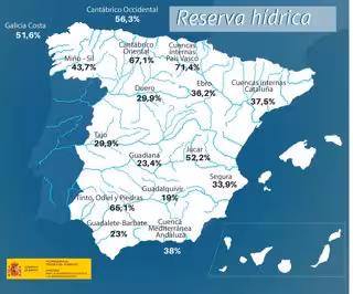 La reserva por ámbitos es la siguiente: Cantábrico Oriental se encuentra al 67,1%; Cantábrico Occidental al 56,3%; Miño-Sil al 43,7%; Galicia Costa al 51,6%; Cuencas internas del País Vasco al 71,4%; Duero al 29,9%; Tajo al 35,5%; Guadiana al 23,4%; Tinto, Odiel y Piedras al 65,1%; Guadalete-Barbate al 23%; Guadalquivir al 19%; Cuenca Mediterránea Andaluza al 38%; Segura al 33,9%; Júcar al 52,2%; Ebro al 36,2%; y Cuencas internas de Cataluña al 37,5%.