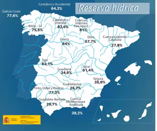 Por su parte, la reserva del Guadiana está al 34,6%; de Tinto, Odiel y Piedras al 77,3%; Guadalete-Barbate al 29,7%; Guadalquivir al 25,7%; Cuenca Mediterránea Andaluza al 38,2%; Segura al 35,9%; Júcar al 61,4%; Ebro al 57,7%; y Cuencas internas de Cataluña al 27,8%.