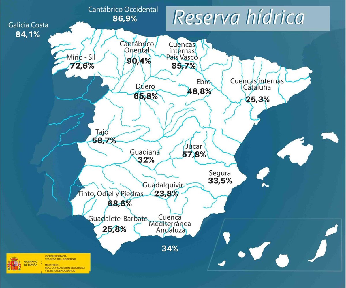 Sin embargo, están por debajo de la mitad de su capacidad las cuencas del Guadiana, que está al 32 por ciento; Guadalete-Barbate, que está al 25,8 por ciento; Guadalquivir, al 23,8 por ciento; la cuenca Mediterránea Andaluza, al 34 por ciento; Segura, al 33,5 por ciento; Ebro, al 48,8 por ciento y las cuencas internas de Cataluña, al 25,3 por ciento.