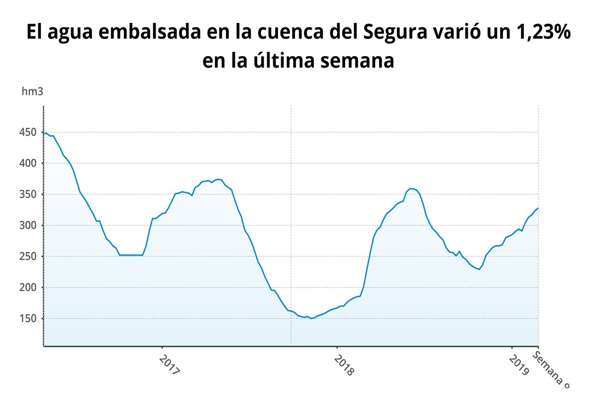 Los pantanos de la cuenca del Segura cuentan con unas reservas de 328 hectómetros cúbicos, cuatro hectómetros cúbicos más que la semana pasada, según datos del Ministerio para la Transición Ecológica recogidos por Europa Press.