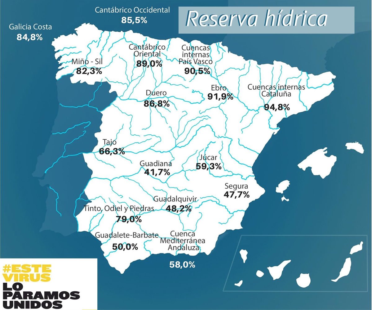 Además, Guadiana está al 41,7 por ciento; Tinto, Odiel y Piedras, al 79 por ciento; Guadalete-Barbate, al 50 por ciento; Guadalquivir, al 48,2 por ciento; la cuenca Mediterránea Andaluza, al 58 por ciento; Segura, al 47,7 por ciento; Júcar, al 59,3 por ciento; Ebro, al 91,9 por ciento y las cuencas internas de Cataluña, 94,8 por ciento.