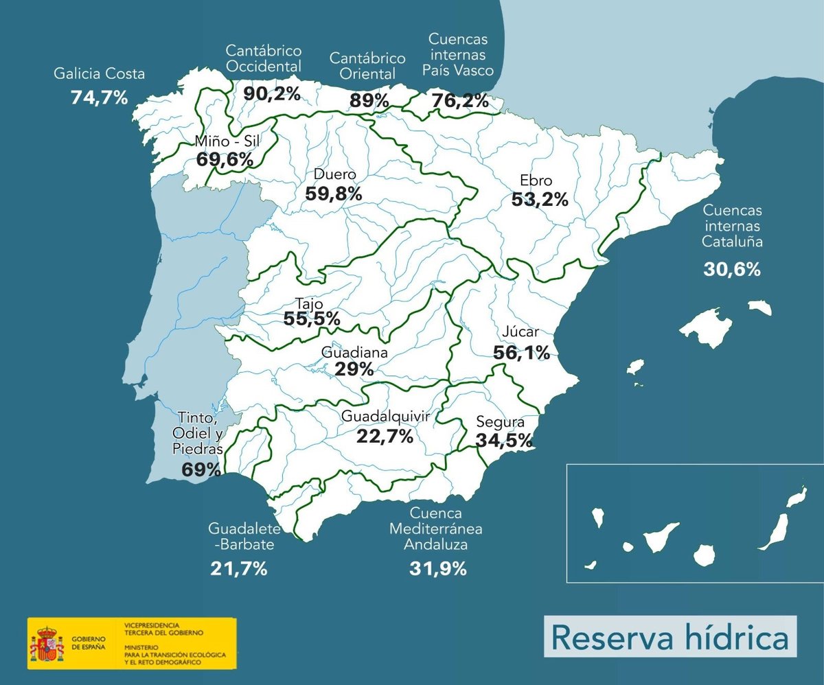 Por ámbitos, la reserva se encuentra al 89 por ciento en Cantábrico oriental; al 90,2 por ciento en Cantábrico Occidental; al 69,6 por ciento, Miño-Sil; al 72,1 por ciento, Galicia Costa; al 76,2 por ciento, las cuencas internas del País Vasco; al 59,8 por ciento, el Duero; al 55,5 por ciento, el Tajo, al 69 por ciento, Tinto, Odiel y Piedras; al 56,1 por ciento, el Júcar; al 53,2 por ciento, el Ebro.