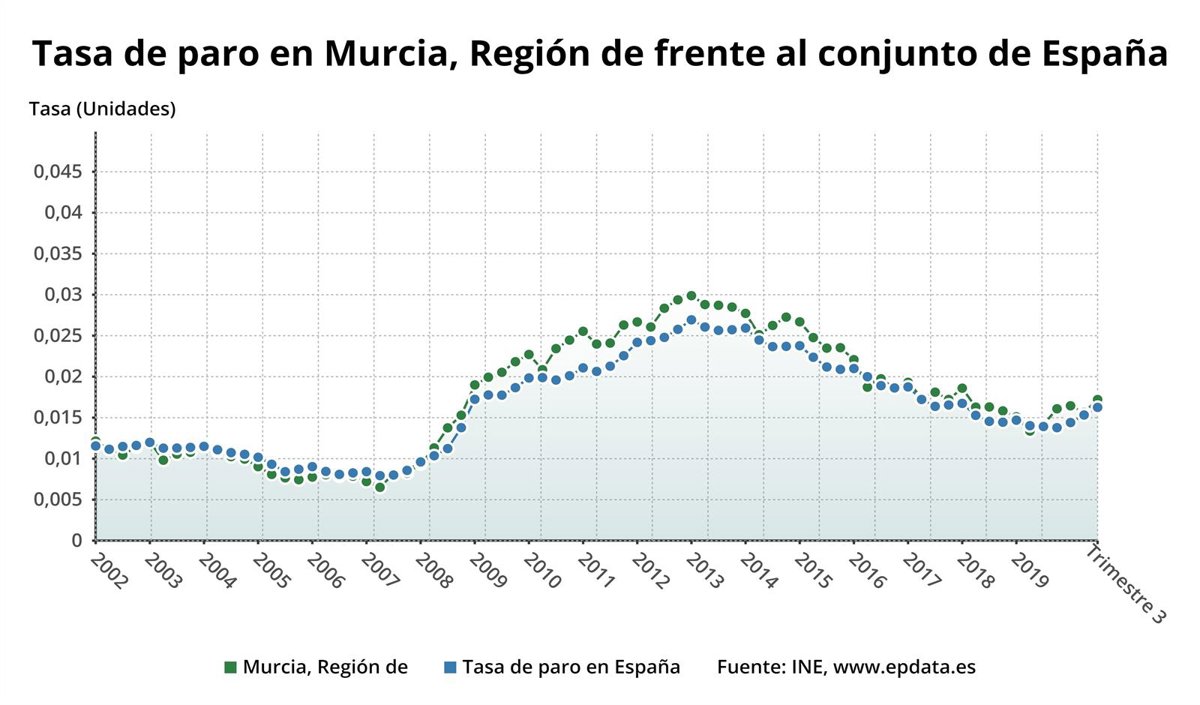 El paro aumentó en 19.300 personas en la Región de Murcia en el tercer trimestre de 2020, un 17,64 por ciento respecto al trimestre anterior, con lo que el número total de desempleados se situó en 128.500 personas y la tasa de paro se situó en 17,21 por ciento, según los datos de la Encuesta de Población Activa (EPA) hecha pública este martes por el Instituto Nacional de Estadística (INE).