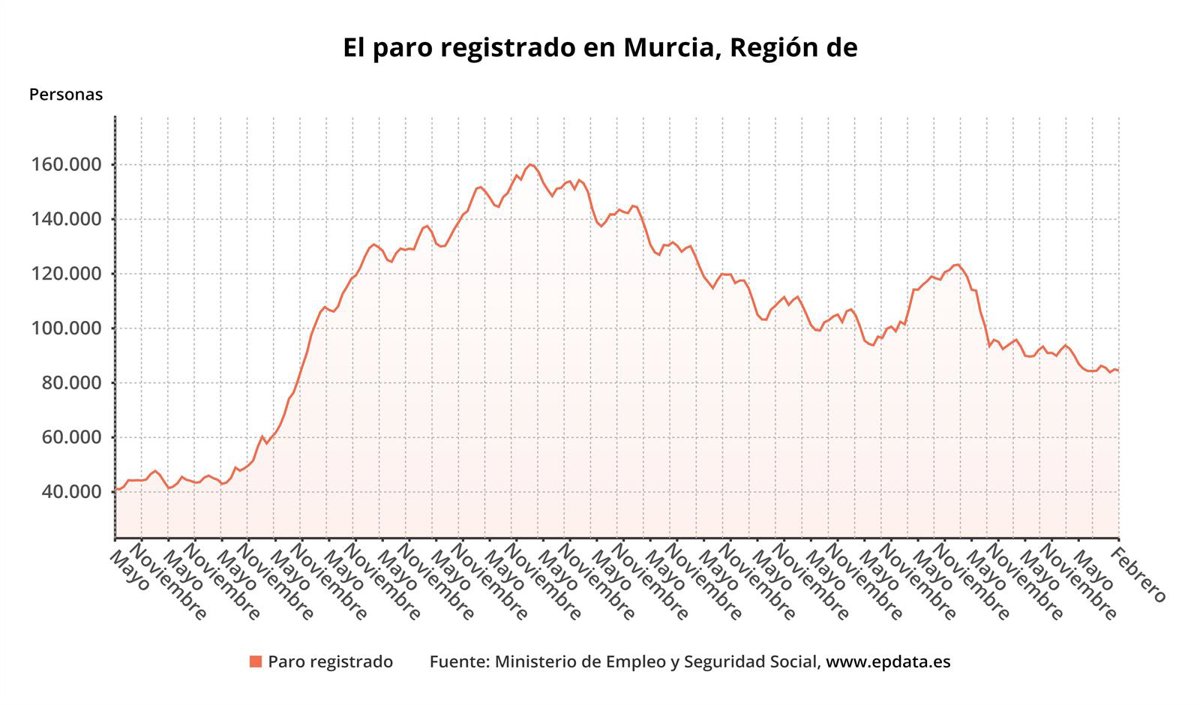 Este número total de desempleados es la cifra más baja en un mes de febrero desde 2008. Desde el inicio de la serie histórica comparable, en 1996, el paro ha subido en febrero la mayoría de veces en Murcia (20 veces) mientras que ha bajado en ocho ocasiones, siendo el descenso del último mes la bajada más pequeña desde 2004.