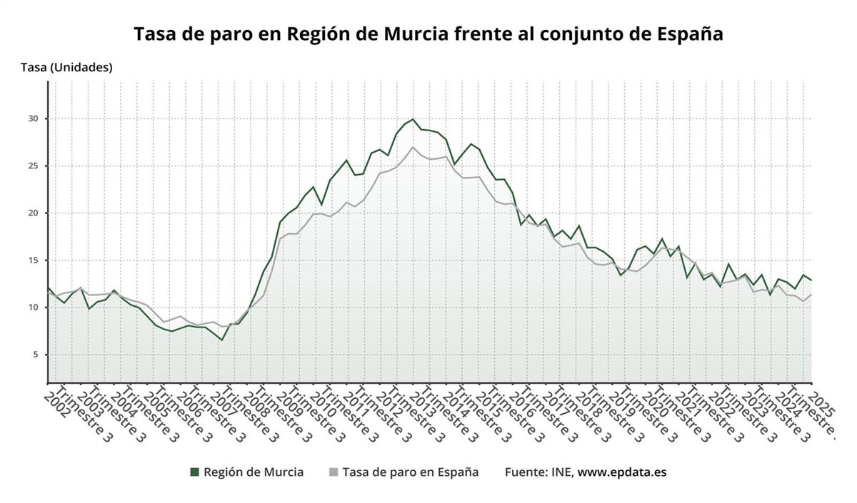 Tasa de paro en Región de Murcia frente al conjunto de España - INE, WWW.EPDATA.ES