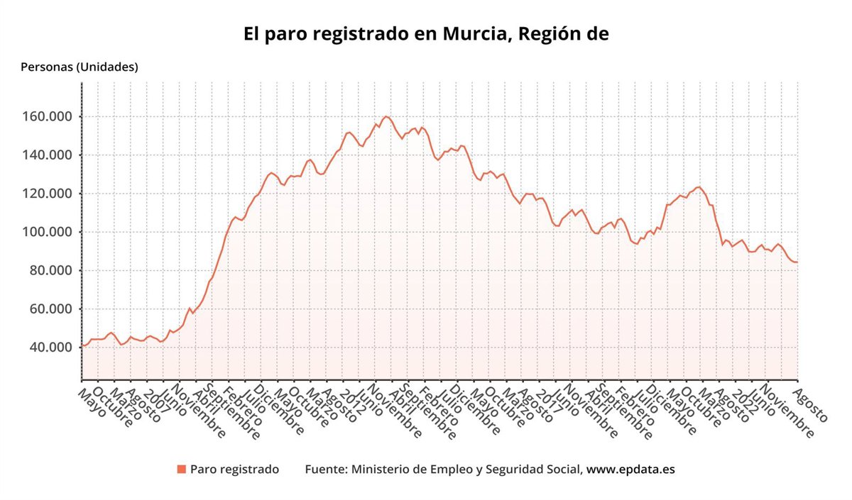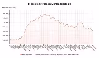 En términos interanuales, el desempleo bajó en los últimos doce meses en Murcia en 7.665 personas (-8,33 por ciento), frente a la disminución del 7,58 por ciento nacional.