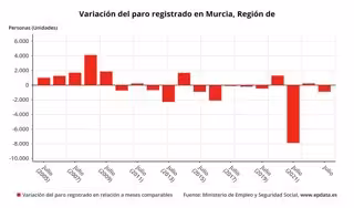 En términos interanuales, el desempleo bajó en los últimos doce meses en Murcia en 5.545 personas (-6,17 por ciento), frente a la disminución del 7,14 por ciento nacional.