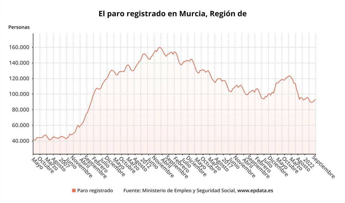 El número de desempleados registrados en las oficinas de los servicios públicos de empleo (antiguo Inem) en la Región de Murcia al término del mes de septiembre se situó en 93.309, lo que supone un aumento de 1.265 personas respecto a agosto, según datos difundidos este martes por el Ministerio de Trabajo y Economía Social.