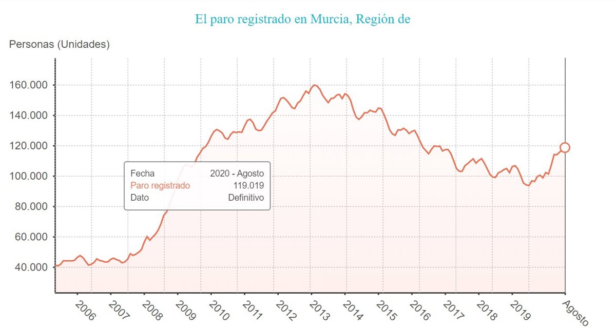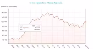 El número de desempleados registrados en las oficinas del Instituto Nacional de Empleo (Inem) en la Región de Murcia al término del mes de agosto se situó en 119.019, lo que supone un aumento de 1.781 personas respecto a julio, según datos difundidos este jueves por el Ministerio de Trabajo, Migraciones y Seguridad Social.