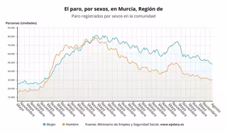 Variación relativa del paro registrado por sexos en agosto en la Región de Murcia en agosto - EPDATA