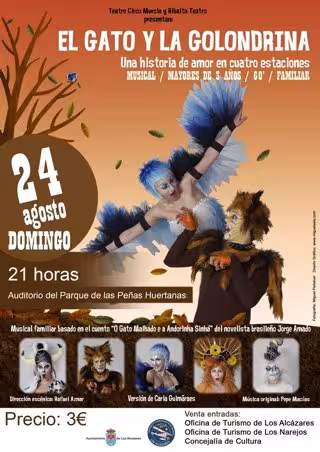 El Auditorio del Parque de las Peñas Huertanas de Los Alcázares acogerá este domingo, a las 21.00 horas, la representación del musical 'El gato y la golondrina', una coproducción del Teatro Circo de Murcia y Ribalta Teatro, según informaron fuentes municipales en un comunicado.