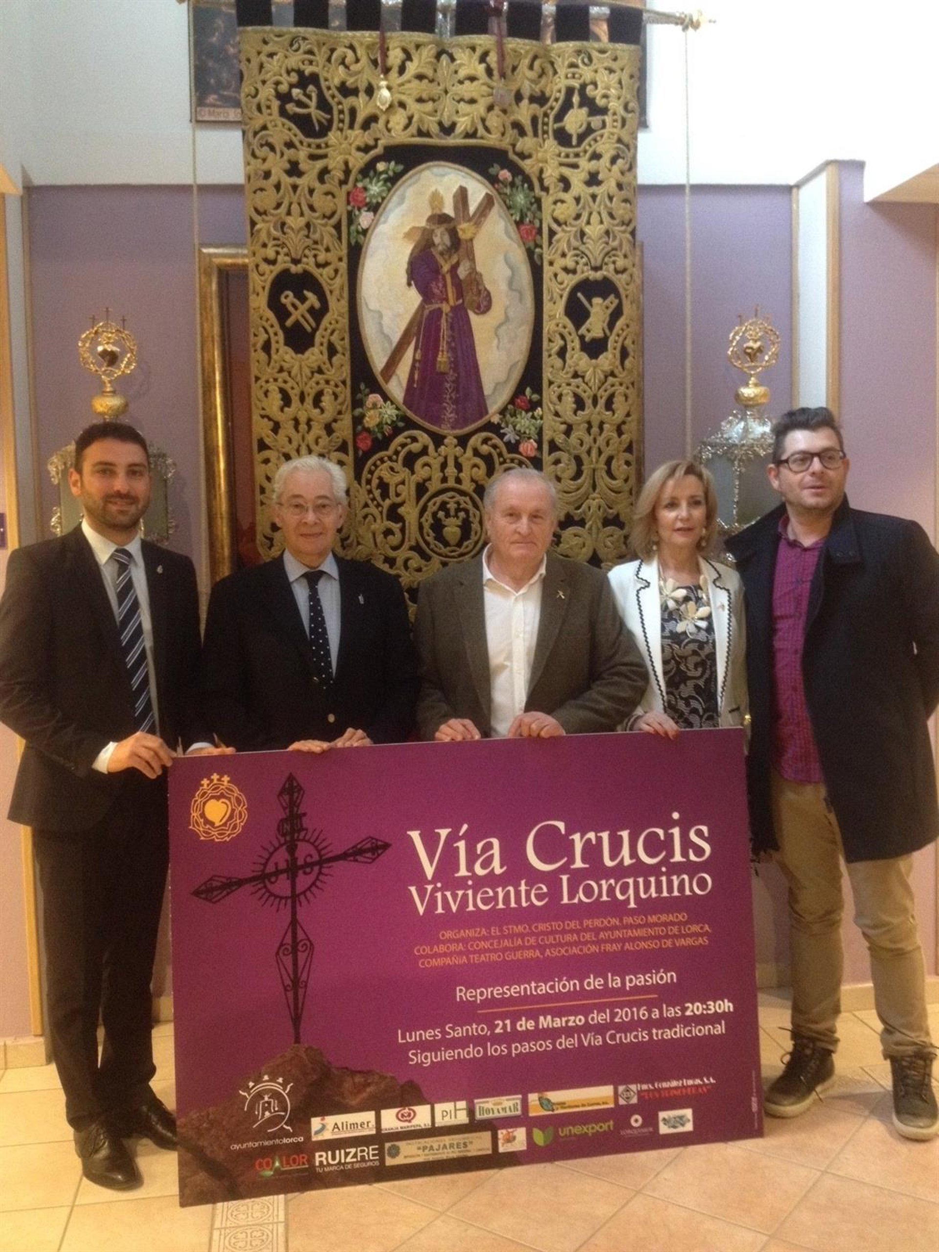 Los concejales de Cultura y Presidencia del Ayuntamiento de Lorca, Agustín Llamas y Eulalia Ibarra, presentaron junto con el presidente del Paso Morado, Fulgencio Martínez, y el responsable de la Compañía del Teatro Guerra, Juan Francisco Ros, la recreación del primer Viacrucis Viviente que se realizará en Lorca este lunes Santo, a partir de las 20.30 horas.
