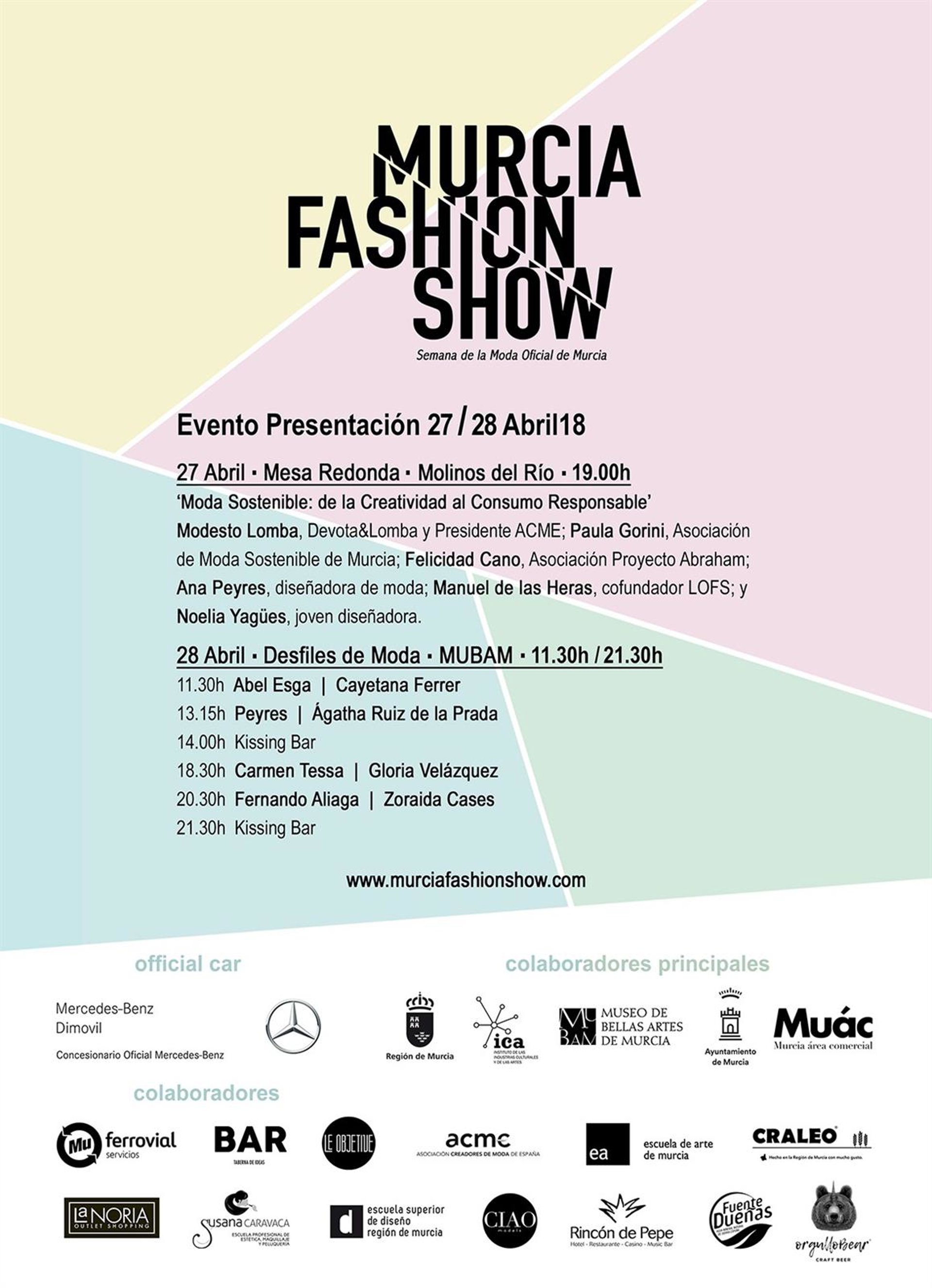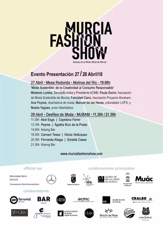 Las actividades organizadas por la plataforma 'Murcia Fashion Show', que para su presentación cuenta con el apoyo de la Consejería de Turismo y Cultura, el Ayuntamiento de Murcia y numerosas empresas, confirma el gran momento creativo que vive la moda en la Región de Murcia y contribuye a fortalecer el tejido formado por escuelas, talleres y empresas.