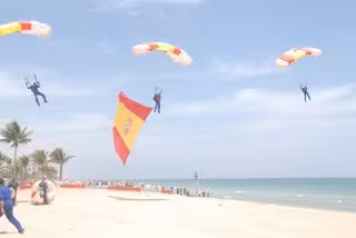 El momento más aclamado por el público fue el de la llegada a tierra de la bandera española de cincuenta y cuatro metros cuadrados, que portada en su pierna por uno de los integrantes del equipo, fue escoltada por otros dos paracaidistas españoles, de forma que los tres alcanzaron la playa al mismo tiempo.