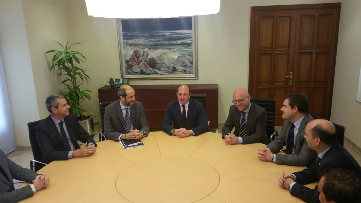 El jefe del Ejecutivo regional, Pedro Antonio Sánchez, se ha reunido este lunes en el Palacio de San Esteban con el presidente de la Asociación de Directivos de la Región de Murcia (Adimur), Javier Navarro, y miembros de su junta directiva, para analizar las medidas puestas en marcha por el Gobierno regional dirigidas a impulsar la recuperación económica, entre las que se encuentra la bajada de impuestos o la simplificación administrativa.