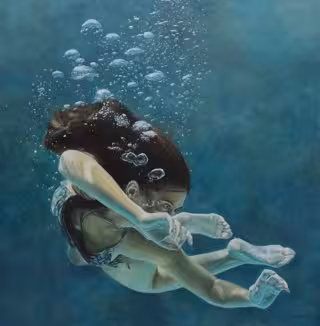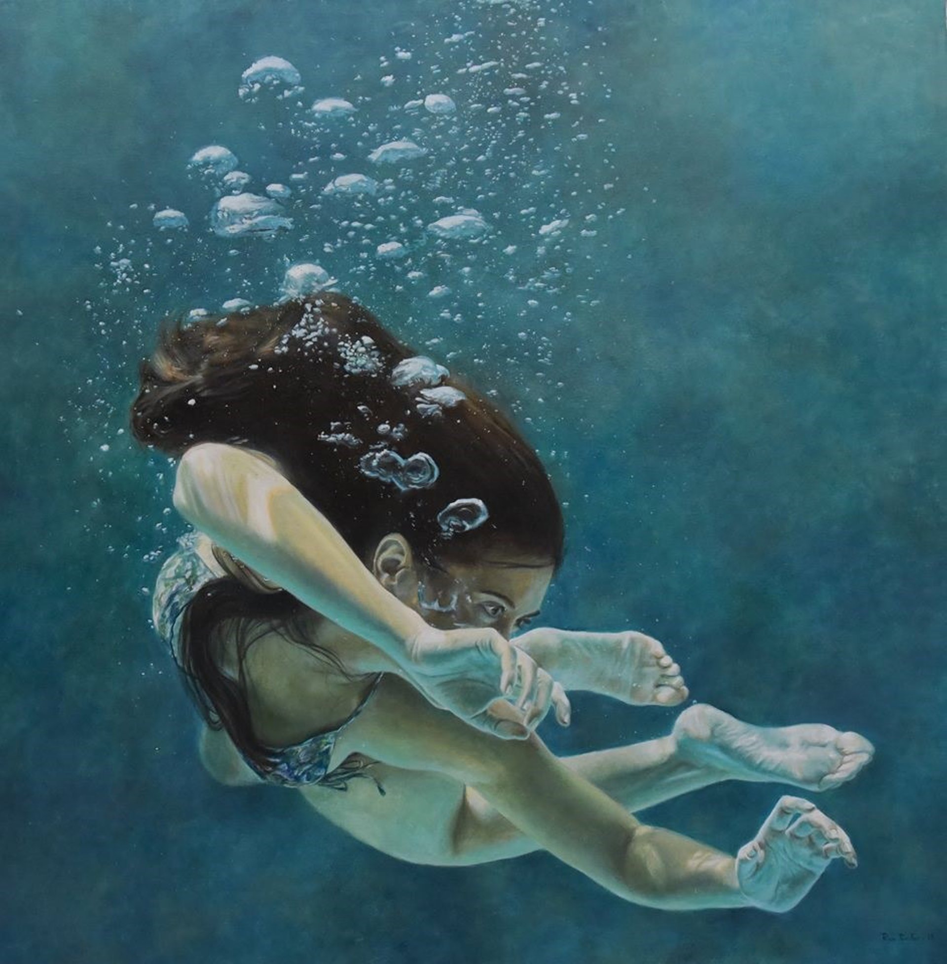'Caja de Agua II' es la segunda parte de una serie pictórica que ya mostró en Cartagena y en la que ha continuado trabajando para realizar esta exhibición que podrá verse hasta el 7 de junio de 2018. Las protagonistas de las obras de Perla Fuertes son mujeres sumergidas que luchan por recuperar el oxígeno, cuyos rostros y expresividad corporal transmiten desasosiego.