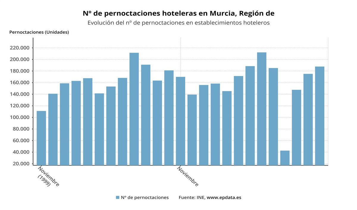 Plantilla EpData - Las pernoctaciones hoteleras en Murcia se elevan un 7,2% en noviembreEuropa Press - EpData
