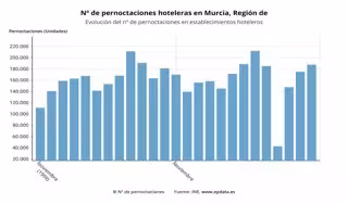 Las pernoctaciones en establecimientos hoteleros en Murcia crecieron un 7,2 por ciento en noviembre en comparación con el mismo mes del año anterior hasta sumar un total de 187.716 pernoctaciones y encadena 32 meses de crecimiento, según los datos publicados por el Instituto Nacional de Estadística (INE). Se trata del quinto mejor dato de pernoctaciones en un mes de noviembre en la región de la serie histórica.