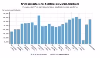 Los hoteles de la Región de Murcia han registrado un total de 150.623 pernoctaciones en diciembre de 2022, lo que supone un incremento del 19,9% en relación a las que hubo en el mismo mes de 2021 (125.551), según ha informado este martes el Instituto Nacional de Estadística (INE).