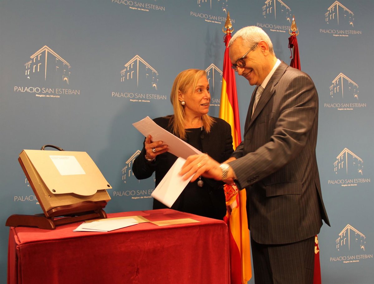 La consejera de Presidencia y Administraciones Públicas, María Pedro Reverte, y el delegado territorial de la ONCE en la Región de Murcia, Agustín Aguilera, han presentado este jueves el 'kit de voto accesible' impulsado por la Comunidad y la campaña informativa para dar a conocer a los invidentes esta posibilidad de voto secreto.