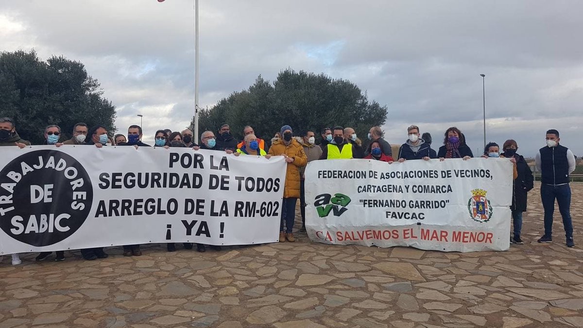 A pesar de ello, desde el Gobierno regional "llevan años prometiendo el arreglo de la carretera, sin haber llevado a cabo ninguna obra sobre la misma", afirman desde Podemos. Ante esta situación, trabajadores de Sabic y vecinos y vecinas de La Aljorra se han concentrado esta mañana en la rotonda de Las Banderas, al inicio de la RM-602, para exigir la adecuación de la obra y la inversión necesaria por parte de la Comunidad Autónoma.