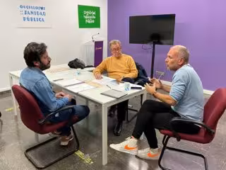 Imagen de la reunión mantenida entre Víctor Egío, secretario de Comunicación de Podemos, y Mario Soler y Abel Novoa, portavoces de la Asociación en Defensa de la Sanidad Pública. - PODEMOS