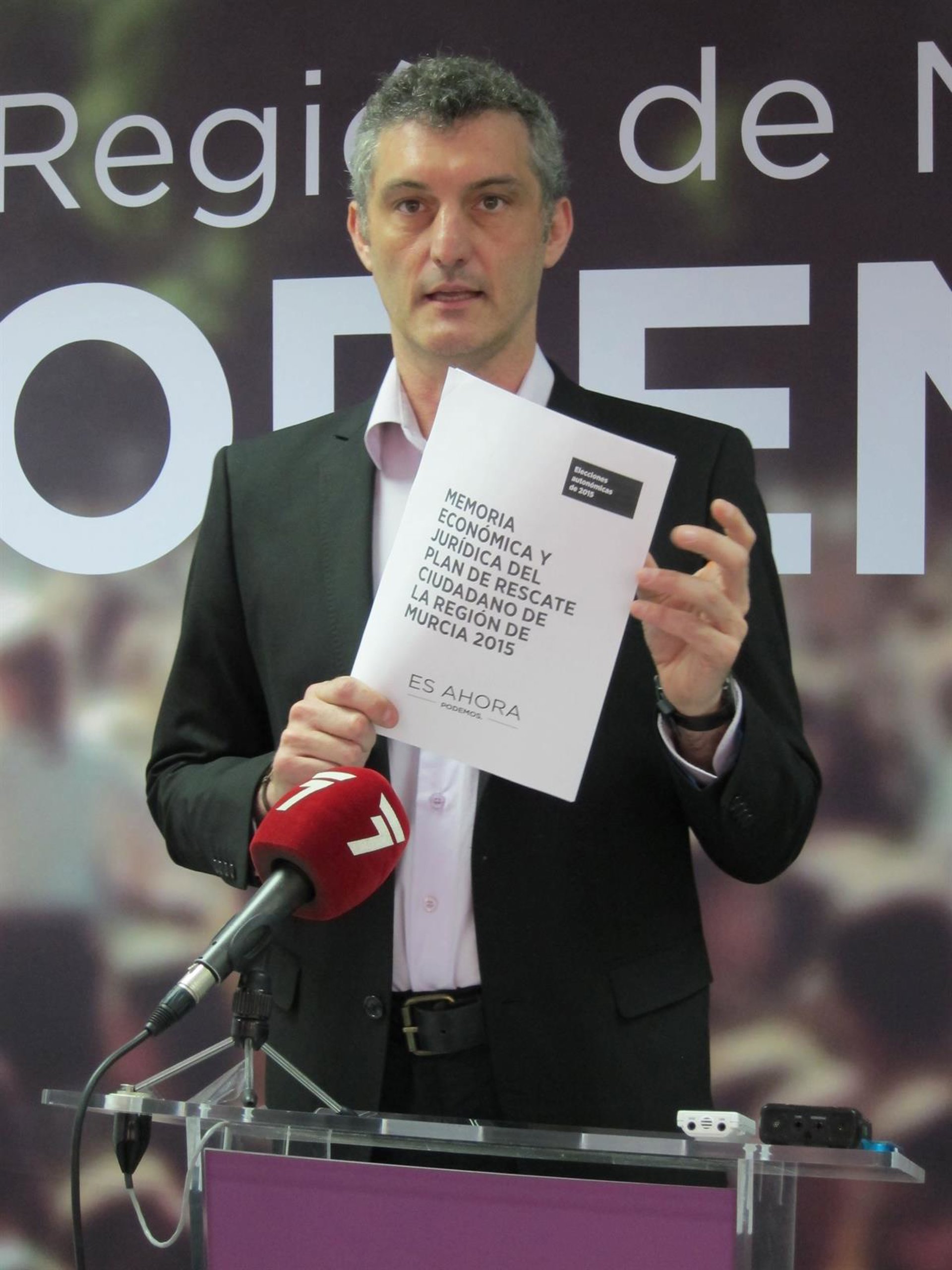 El candidato de Podemos a la presidencia de la Comunidad, Óscar Urralburu, ha presentado este martes su Plan de Rescate Ciudadano para la Región, que implicaría un presupuesto de 112,1 millones de euros y que incluye medidas como una renta mínima a partir de 400 euros para 9.000 familias murcianas sin ingresos de ningún tipo, un refuerzo a comedores escolares, ayudas al arrendamiento de viviendas para 3.000 familias en exclusión social, y un plan para garantizar suministros básicos como la luz, el agua o el gas.