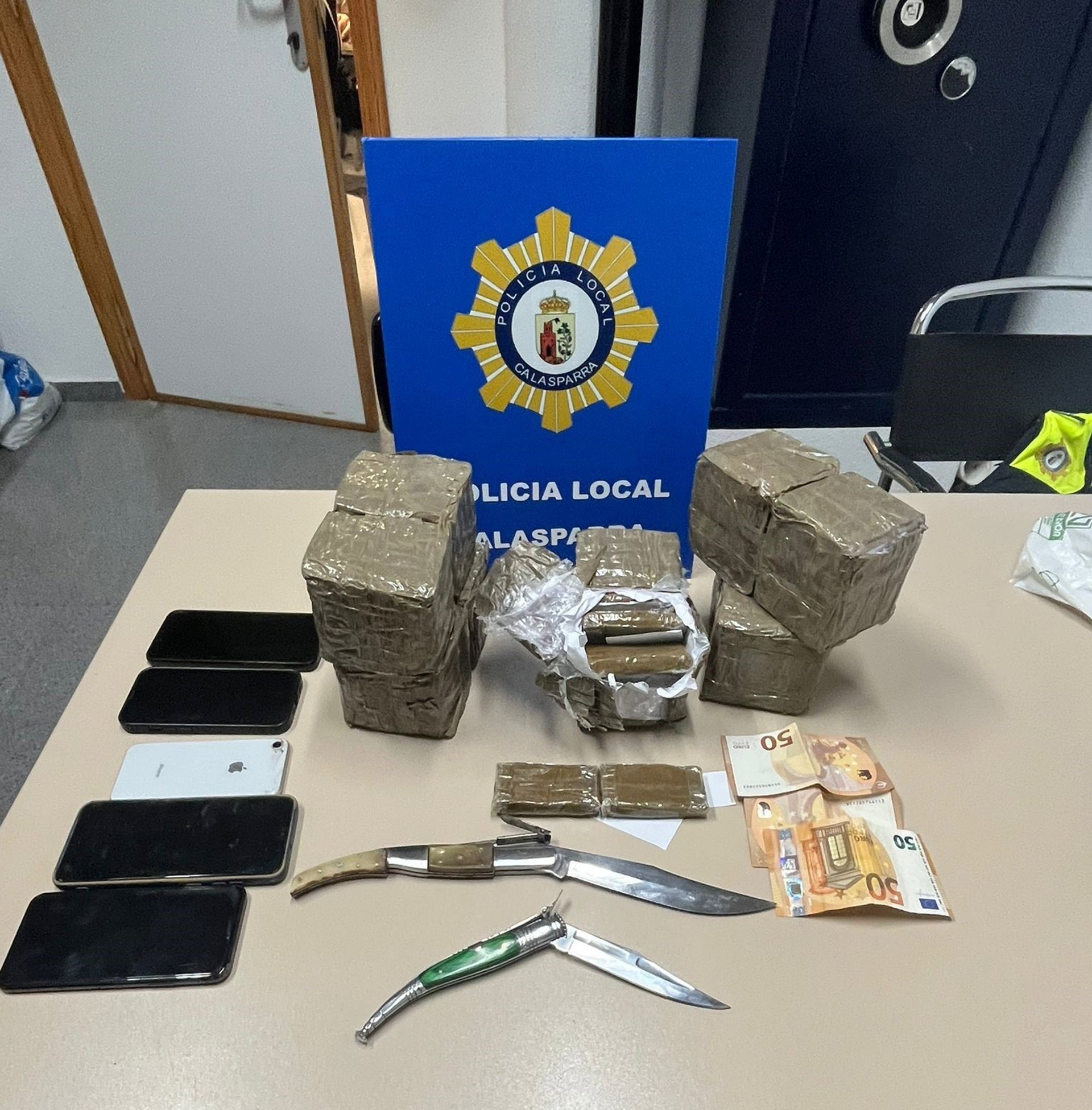 La actuación policial se saldó con la aprehensión de un total de 5,5 kilogramos de hachís, distribuidos en tabletas preparadas presuntamente para su distribución, así como la incautación de armas blancas encontradas durante la intervención, según han informado desde el Consistorio.