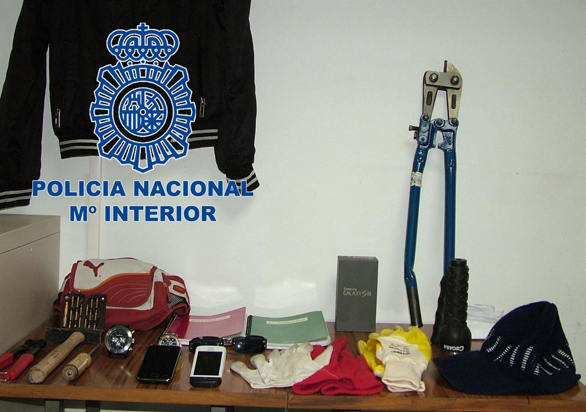 La Policía pudo recuperar después la bolsa abandonada por el detenido, donde se encontraron herramientas habitualmente utilizadas para la comisión de robos con fuerza, tales como cizallas, un martillo, dos destornilladores, dos linternas, gafas de sol, guantes de plástico, guantes de tela y gorra para ocultar parcialmente el rostro.