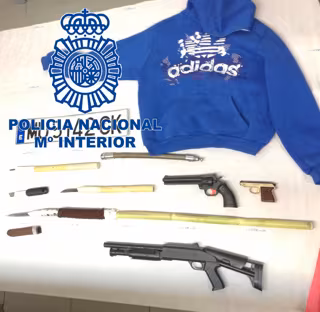 Gracias al dispositivo establecido para su localización y detención, el pasado día 7 de febrero, se consiguió llevar a cabo el arresto del presunto autor de los hechos y se procedió al registro de su domicilio, donde se encontraron varias armas de fuego simuladas, una placa de matrícula sustraída y algunas armas blancas de fabricación casera.