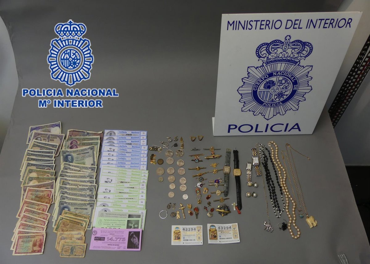 Los investigadores lograron incautar numerosos objetos --teléfonos móviles, joyas de oro, relojes, insignias, billetes antiguos y monedas de colección, entre otros-, algunos procedentes de los dos robos investigados y que han podido ser entregados a sus propietarios.