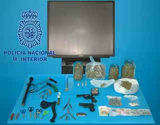 En total, se intervinieron 450 dosis de marihuana; 414 euros en efectivo; dos pistolas de fogueo; una dosis de cocaína; un hacha, tres navajas automáticas, tres navajas multiusos; una defensa policial; y una sierra para el corte de plantas.