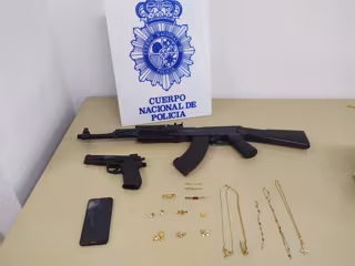 Tras llevar a cabo las detenciones, los agentes practicaron un registro domiciliario en la localidad de Puente Tocinos (Murcia), en donde intervinieron, además de numerosas joyas, de las que se investiga su procedencia, un arma corta simulada y subfusil simulado tipo AK-47.