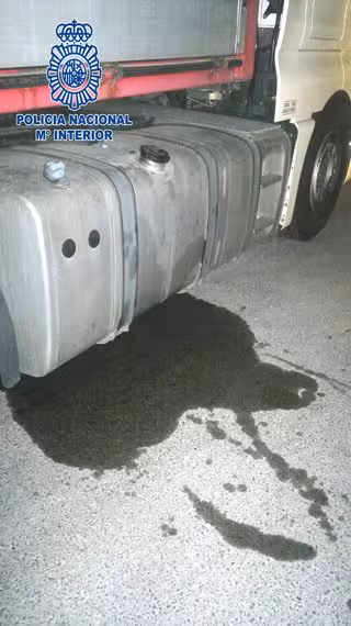 En la madrugada del pasado 24 de agosto, sobre las 3.00 horas, una dotación policial uniformada observó, mientras patrullaba por las inmediaciones de una gasolinera en la que habitualmente una empresa de transportes estaciona sus vehículos, una cabeza tractora y junto a su depósito de gasoil y ocultados disimuladamente, dos bidones de plástico de unos 25 litros.