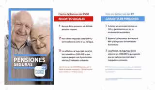 En el segundo díptico, relativo a las pensiones, el PP denuncia los recortes sociales del PSOE, puesto que, según explica, se ha producido un recorte de las pensiones a 8.800.000 personas mayores; han subido los impuestos como el IVA y los servicios básicos como la luz y el agua; y los afiliados a la Seguridad Social se han reducido en 2.000.000, lo que supone que por cada tres pensionistas sólo hay un trabajador cotizando.
